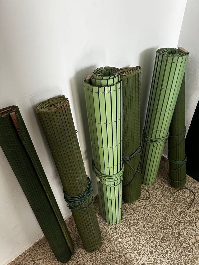Conjunto de persianas enrollables hechas de bambú. Son ideales para decorar o dar privacidad. - Color: Verde - Se venden enrolladas y atadas con cuerda.