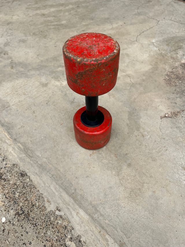 Mancuerna de 8kg, ideal para ejercicio. Es roja y tiene un aspecto algo desgastado por el uso. - Pesa 8 kilogramos. - Color rojo.