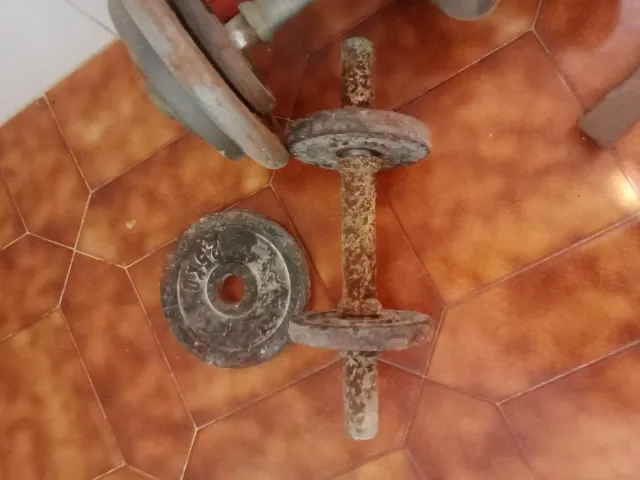 Pesa de gimnasio con un diseño clásico, ideal para añadir a tu equipo de entrenamiento. - Barra central con discos. - Aspecto rústico por el óxido.