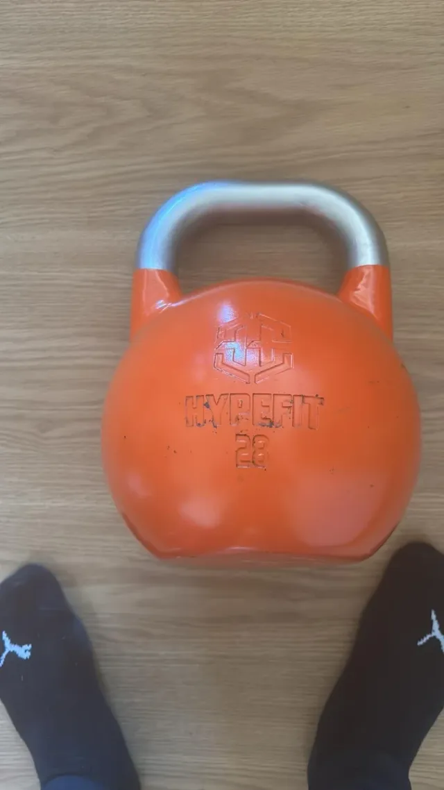 Pesa rusa de entrenamiento con un peso de 28 kg. - Color naranja brillante. - Asa plateada. - Marca HYPERFIT grabada.