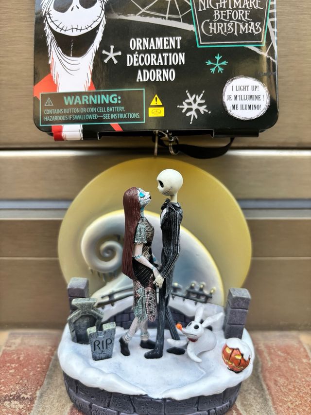 Su encantador diseño incluye a Jack Skellington y Sally disfrutando de una velada bajo la luz de la luna, con Zero flotando cerca. Además, tiene detalles brillantes y una base nevada de la Ciudad de Halloween.