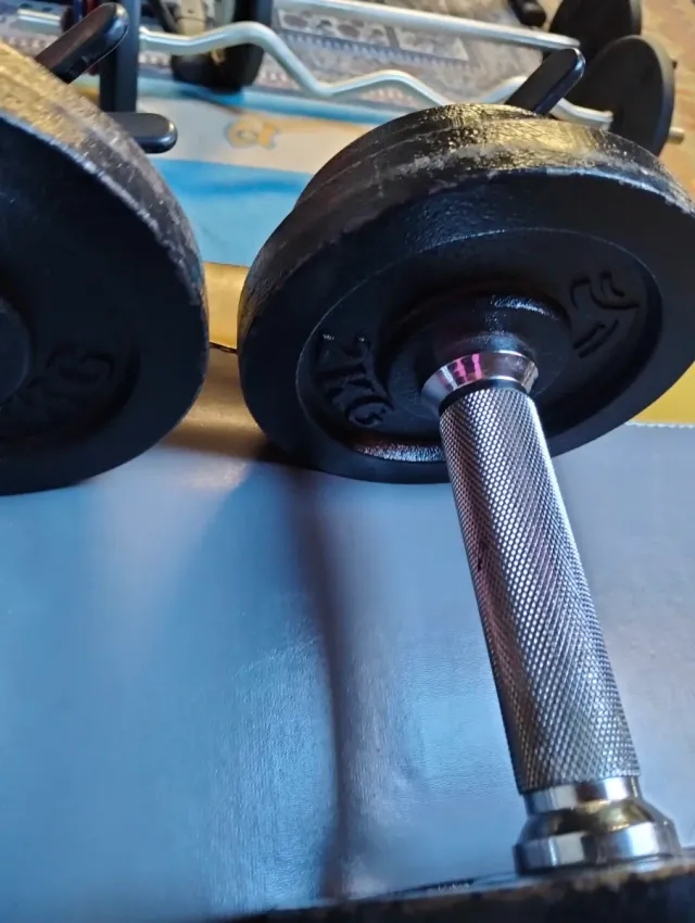 Mancuerna de 10 kg Ideales para entrenamientos de fuerza. - Discos de 8 kg. - Empuñadura texturizada para un mejor agarre 2 kg 2 seguros