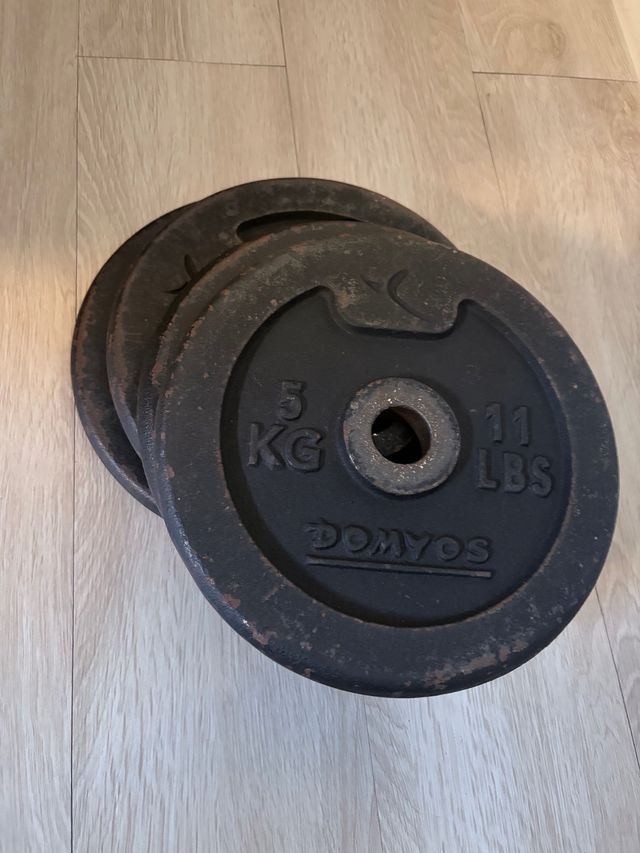 Detalles del producto4 Disco de pesa de 5 kg (11 lbs) de la marca DOMYOS. Ideal para entrenamiento de fuerza.