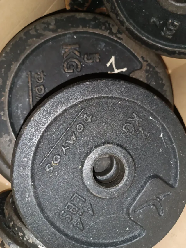 Conjunto de discos de pesas de diferentes tamaños. - Disco de 5 kg. - Disco de 2 kg. - Disco de 1 kg. Precio depende de las uds y kg 2 de 1kg, 5€ 4 de 2kg, 15€ Y 4 de 5kg, 30€