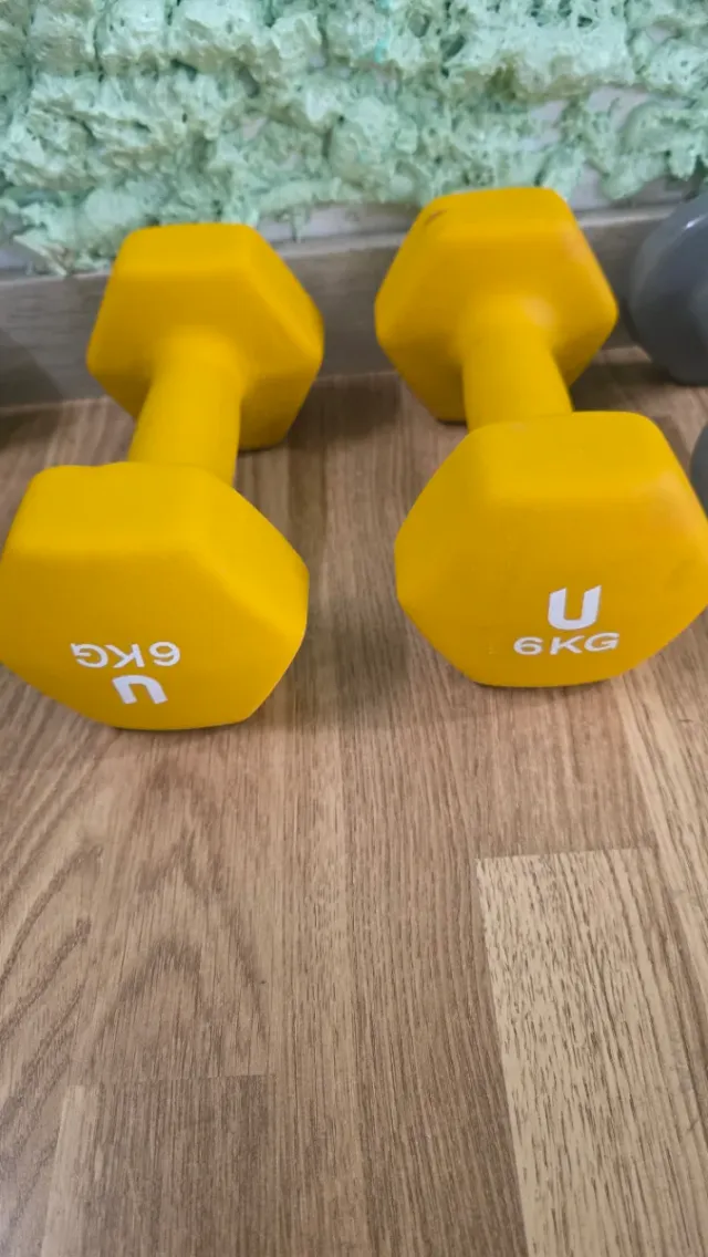 Par de mancuernas amarillas de 6kg cada una. Ideales para entrenamientos en casa. - Color: Amarillo - Peso: 6 kg cada una - Diseño hexagonal para evitar que rueden