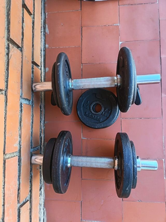 Set de pesas para entrenamiento en casa o gimnasio. Incluye barras y discos de diferentes pesos. - Discos de 2.5 kg. - Mangos texturizados para mejor agarre.
