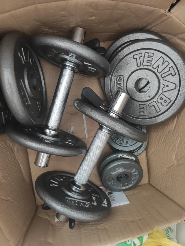 Set de pesas y discos para entrenamiento en casa. - Dos mancuernas con mangos texturizados. - Discos de diferentes pesos, incluyendo de 3.0 kg, 2 kg y 0,5 kilo