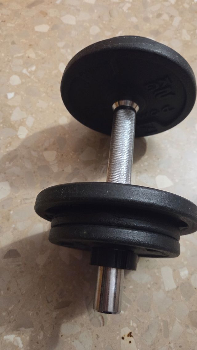 Mancuernas de con discos de hierro con x2 de 2 Kg y x 4 de 1 Kg, barra de 2 Kg, de decathlon marca Domyos, casi sin uso. Total peso 10 Kg.