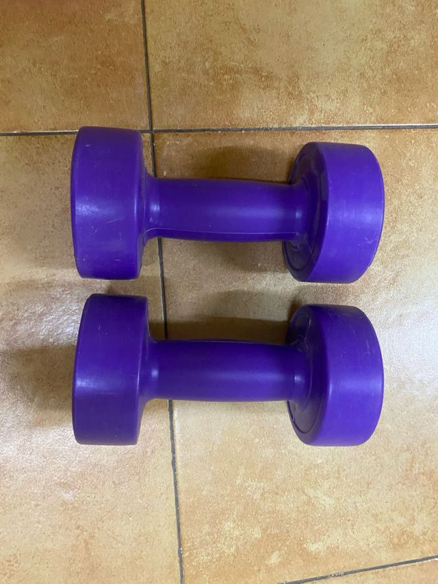 Par de pesas moradas de 1 kg cada una. Ideales para ejercicios en casa. - Color: Morado. - Peso: 1 kg cada pesa.