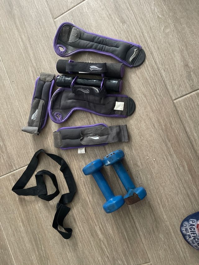 Set de pesas para tobillos y muñecas, junto con un par de mancuernas. - Pesas ajustables con velcro. - Color púrpura y negro. - Dos mancuernas de color azul.