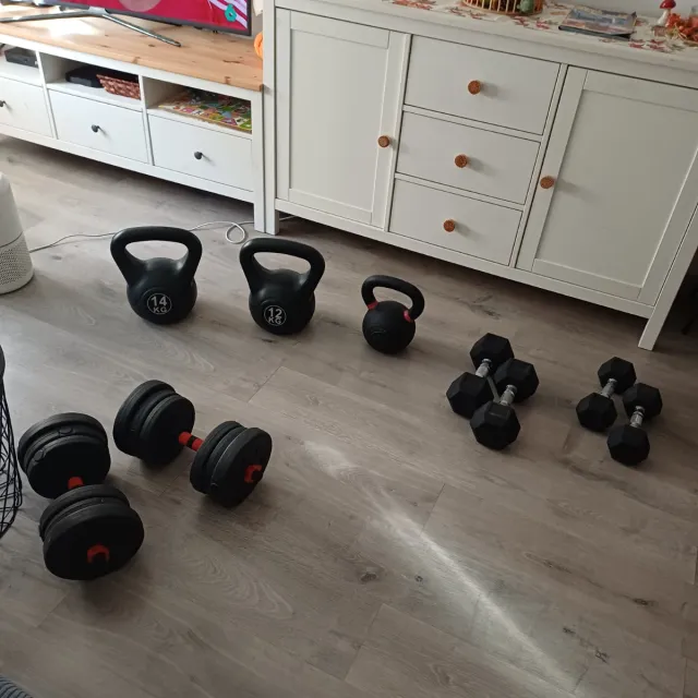 - Tres kettlebells de diferentes pesos (14 kg, 12 kg y 20 kg)