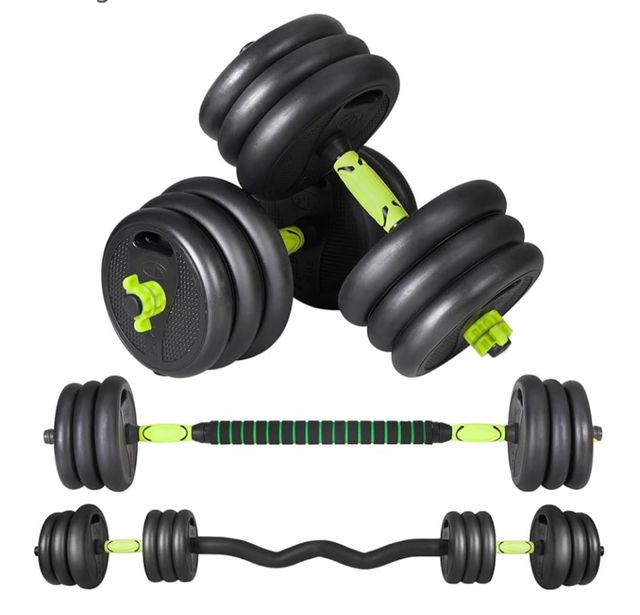 Detalles del productoSet de pesas y mancuernas ajustables, ideal para entrenar en casa. Incluye barra.