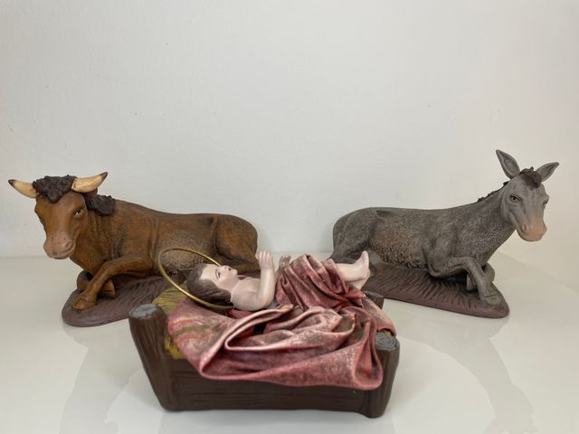 Pesebre de 30cm de la casa PUIG, pintado a mano. BUEY, MULA y NIÑO JESUS