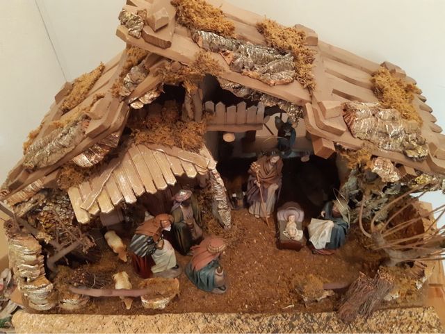 Figuras: niño en la cuna, Virgen María, San José, buey, mula, ángel, 3 reyes adorando y dos ovejas.