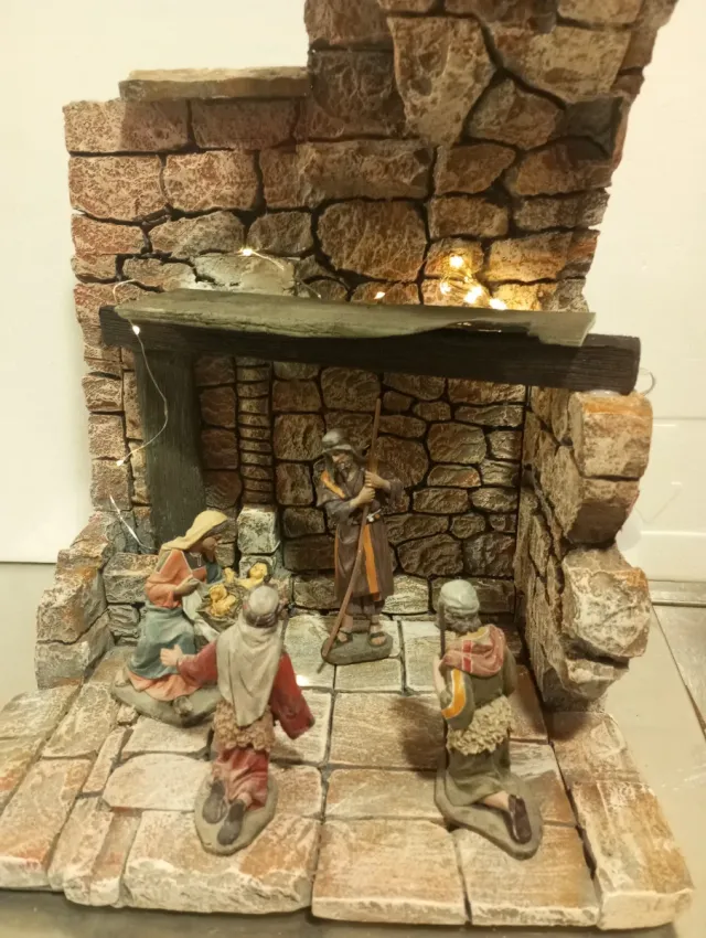 Detalles del productoPrecioso pesebre de Navidad con un diseño rústico de piedra y detalles iluminados.