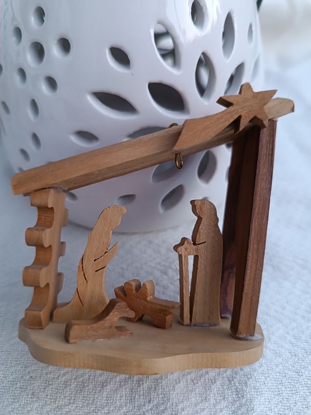 Detalles del productoBelén de madera, ss una pieza pequeña y encantadora, perfecta para colocar en un estante o en el árbol de Navidad.