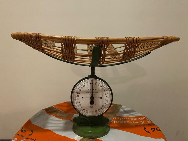 la cesta es mimbre en buen edtado el peso se mueve y adapta , tiene algo de oxido , debido a sus años