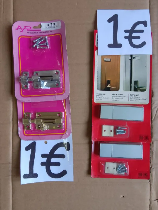 Detalles del productoLote de pestillos para puertas, disponibles en acabado plateado y dorado. Incluye tornillos para su instalación.