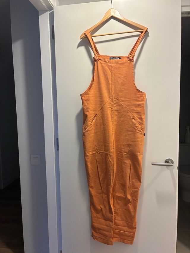 Peto largo de la marca PITAGORA en color naranja. Diseño con tirantes y bolsillos.