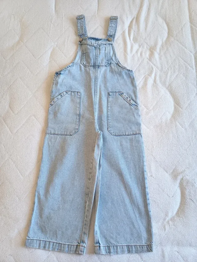 Peto vaquero de Zara en talla 8. Un básico cómodo y versátil. - Tejido vaquero de color azul claro. - Diseño con tirantes ajustables. - Bolsillos delanteros. - Pierna ancha.