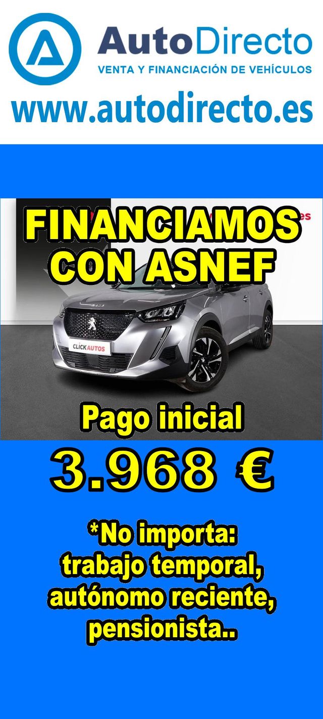 Detalles del producto¿No consigues financiación? ¡Tenemos la solución! *************************************************************************** RENT CREDIT: Aprobamos más del 90% de las operaciones. No importa ASNEF o RAI, impagos pendientes, ser autónomo o empresa reciente, ser pensionista. Imprescindible pago inicial del 20%. Ejemplo de operación: PEUGEOT 2008 1.5 BLUEHDI 130CV ALLURE EAT8. Ref. W952073LYY - Precio vehículo financiado: 19840 €. - Pago inicial de 3968 €. - Cuota mes desde 414 €. - Impuesto de circulación y garantía (mínimo 1 año) incluidos. *************************************************************************** ✅ Más de 3.000 COCHES Y FURGONETAS EN STOCK. ✅ HASTA 2 AÑOS DE GARANTIA. ✅ Kilómetros certificados. ✅ 17 concesionarios repartidos en toda España. ♻️ Aceptamos tu coche como parte del pago. *************************************************************************** IMPORTANTE: -. Este anuncio, no es vinculante, puede contener errores. SE MUESTRAN A TÍTULO INFORMATIVO Y NO CONTRACTUAL. -. Consultar disponibilidad del vehículo y datos exactos: fecha de matriculación, importes, etc,... *************************************************************************** Te ofrecemos distintas opciones: financiación, renting, alquiler con opción a compra, rent credit. En nuestro stock disponible encontraras: 3008 , qashqai , corolla , rav4 , sandero , Duster , yaris , 2008 , Tucson , Ibiza , 208 , Sportage , a3 , c4 , Formentor , q3 , yaris cross , 500 , c3 , arona , zs , x1 , kona , corsa , clase a , león , 308 , serie 1 , golf , focus , captur , a1 , tiguan , i20 , t roc , stonic , xc40 , civic , q5 , serie 3 , glb , 5008 , ateca , clio , kuga , c hr , i30 , arkana , juke , a4 , x3 , cx 5 , xc60 , kamiq , taigo , Mustang , x6 , polo , ceed , karoq , x2 , Astra , niro , cx 30 , a5 , cooper , megane , moka , fiesta , hs , q2 , clase c , serie 3 , renegade , picanto.
