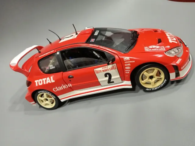 Detalles del productoRéplica detallada del Peugeot 206 de rally a escala 1/18. Este modelo representa el coche de competición del Rallye Monte-Carlo en muy buen estado,conserva todas las antenas y los espejos,precio 25€