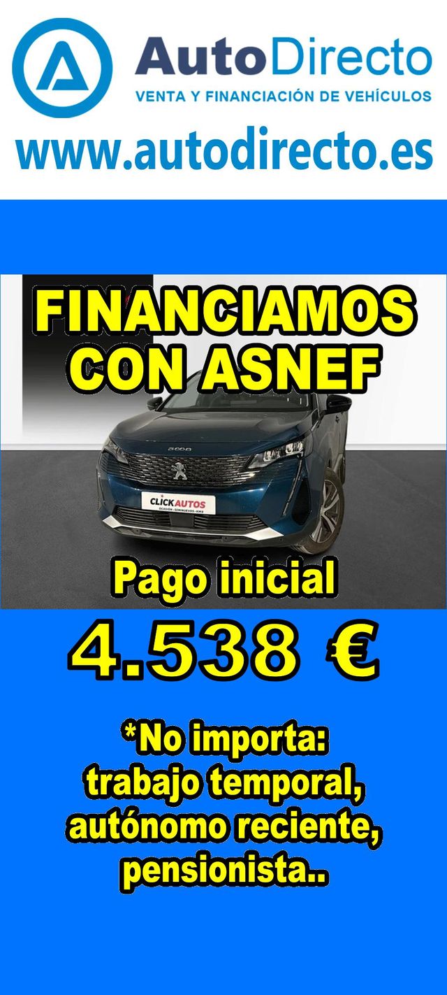 Detalles del producto¿No consigues financiación? ¡Tenemos la solución! *************************************************************************** RENT CREDIT: Aprobamos más del 90% de las operaciones. No importa ASNEF o RAI, impagos pendientes, ser autónomo o empresa reciente, ser pensionista. Imprescindible pago inicial del 20%. Ejemplo de operación: PEUGEOT 5008 1.2 PURETECH 130CV ALLURE EAT8. Ref. W959773LYF - Precio vehículo financiado: 22690 €. - Pago inicial de 4538 €. - Cuota mes desde 472 €. - Impuesto de circulación y garantía (mínimo 1 año) incluidos. *************************************************************************** ✅ Más de 3.000 COCHES Y FURGONETAS EN STOCK. ✅ HASTA 2 AÑOS DE GARANTIA. ✅ Kilómetros certificados. ✅ 17 concesionarios repartidos en toda España. ♻️ Aceptamos tu coche como parte del pago. *************************************************************************** IMPORTANTE: -. Este anuncio, no es vinculante, puede contener errores. SE MUESTRAN A TÍTULO INFORMATIVO Y NO CONTRACTUAL. -. Consultar disponibilidad del vehículo y datos exactos: fecha de matriculación, importes, etc,... *************************************************************************** Te ofrecemos distintas opciones: financiación, renting, alquiler con opción a compra, rent credit. En nuestro stock disponible encontraras: 3008 , qashqai , corolla , rav4 , sandero , Duster , yaris , 2008 , Tucson , Ibiza , 208 , Sportage , a3 , c4 , Formentor , q3 , yaris cross , 500 , c3 , arona , zs , x1 , kona , corsa , clase a , león , 308 , serie 1 , golf , focus , captur , a1 , tiguan , i20 , t roc , stonic , xc40 , civic , q5 , serie 3 , glb , 5008 , ateca , clio , kuga , c hr , i30 , arkana , juke , a4 , x3 , cx 5 , xc60 , kamiq , taigo , Mustang , x6 , polo , ceed , karoq , x2 , Astra , niro , cx 30 , a5 , cooper , megane , moka , fiesta , hs , q2 , clase c , serie 3 , renegade , picanto.