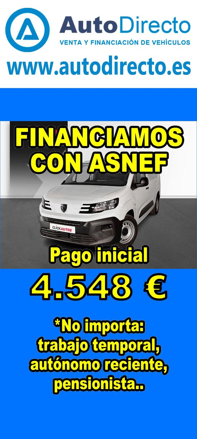 Detalles del producto¿No consigues financiación? ¡Tenemos la solución! *************************************************************************** RENT CREDIT: Aprobamos más del 90% de las operaciones. No importa ASNEF o RAI, impagos pendientes, ser autónomo o empresa reciente, ser pensionista. Imprescindible pago inicial del 20%. Ejemplo de operación: PEUGEOT PARTNER 1.5 BLUEHDI 100CV LONG. Ref. W955517MRT - Precio vehículo financiado: 22740 €. - Pago inicial de 4548 €. - Cuota mes desde 473 €. - Impuesto de circulación y garantía (mínimo 1 año) incluidos. *************************************************************************** ✅ Más de 3.000 COCHES Y FURGONETAS EN STOCK. ✅ HASTA 2 AÑOS DE GARANTIA. ✅ Kilómetros certificados. ✅ 17 concesionarios repartidos en toda España. ♻️ Aceptamos tu coche como parte del pago. *************************************************************************** IMPORTANTE: -. Este anuncio, no es vinculante, puede contener errores. SE MUESTRAN A TÍTULO INFORMATIVO Y NO CONTRACTUAL. -. Consultar disponibilidad del vehículo y datos exactos: fecha de matriculación, importes, etc,... *************************************************************************** Te ofrecemos distintas opciones: financiación, renting, alquiler con opción a compra, rent credit. En nuestro stock disponible encontraras: 3008 , qashqai , corolla , rav4 , sandero , Duster , yaris , 2008 , Tucson , Ibiza , 208 , Sportage , a3 , c4 , Formentor , q3 , yaris cross , 500 , c3 , arona , zs , x1 , kona , corsa , clase a , león , 308 , serie 1 , golf , focus , captur , a1 , tiguan , i20 , t roc , stonic , xc40 , civic , q5 , serie 3 , glb , 5008 , ateca , clio , kuga , c hr , i30 , arkana , juke , a4 , x3 , cx 5 , xc60 , kamiq , taigo , Mustang , x6 , polo , ceed , karoq , x2 , Astra , niro , cx 30 , a5 , cooper , megane , moka , fiesta , hs , q2 , clase c , serie 3 , renegade , picanto.