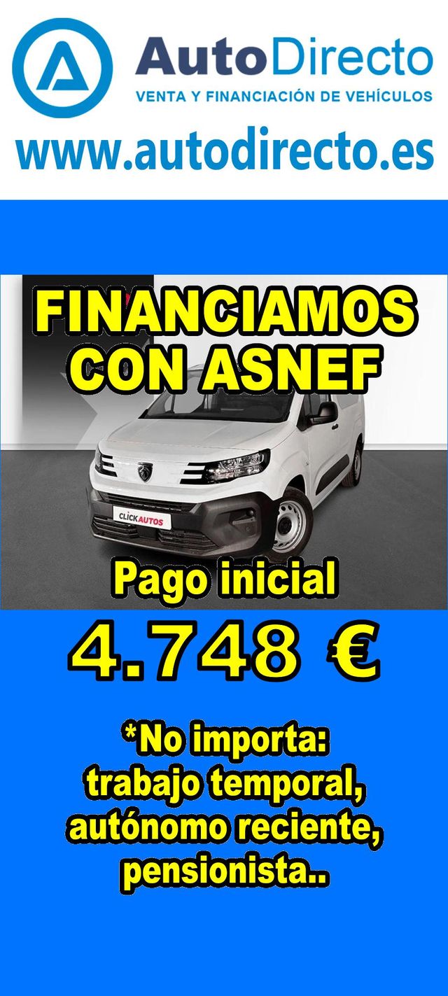 Detalles del producto¿No consigues financiación? ¡Tenemos la solución! *************************************************************************** RENT CREDIT: Aprobamos más del 90% de las operaciones. No importa ASNEF o RAI, impagos pendientes, ser autónomo o empresa reciente, ser pensionista. Imprescindible pago inicial del 20%. Ejemplo de operación: PEUGEOT PARTNER 1.5 BLUEHDI 100CV LONG. Ref. W953052MSM - Precio vehículo financiado: 23740 €. - Pago inicial de 4748 €. - Cuota mes desde 494 €. - Impuesto de circulación y garantía (mínimo 1 año) incluidos. *************************************************************************** ✅ Más de 3.000 COCHES Y FURGONETAS EN STOCK. ✅ HASTA 2 AÑOS DE GARANTIA. ✅ Kilómetros certificados. ✅ 17 concesionarios repartidos en toda España. ♻️ Aceptamos tu coche como parte del pago. *************************************************************************** IMPORTANTE: -. Este anuncio, no es vinculante, puede contener errores. SE MUESTRAN A TÍTULO INFORMATIVO Y NO CONTRACTUAL. -. Consultar disponibilidad del vehículo y datos exactos: fecha de matriculación, importes, etc,... *************************************************************************** Te ofrecemos distintas opciones: financiación, renting, alquiler con opción a compra, rent credit. En nuestro stock disponible encontraras: 3008 , qashqai , corolla , rav4 , sandero , Duster , yaris , 2008 , Tucson , Ibiza , 208 , Sportage , a3 , c4 , Formentor , q3 , yaris cross , 500 , c3 , arona , zs , x1 , kona , corsa , clase a , león , 308 , serie 1 , golf , focus , captur , a1 , tiguan , i20 , t roc , stonic , xc40 , civic , q5 , serie 3 , glb , 5008 , ateca , clio , kuga , c hr , i30 , arkana , juke , a4 , x3 , cx 5 , xc60 , kamiq , taigo , Mustang , x6 , polo , ceed , karoq , x2 , Astra , niro , cx 30 , a5 , cooper , megane , moka , fiesta , hs , q2 , clase c , serie 3 , renegade , picanto.