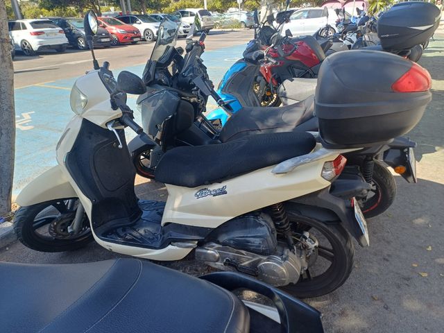 Moto Peugeot Tweet 125 en color crema. - Diseño moderno y ágil. - Asiento cómodo para dos personas. - Baúl trasero para almacenamiento adicional.
