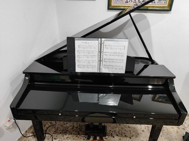 Detalles del productoPiano electrónico con un elegante acabado en negro brillante, imitando el diseño de un piano de cola.