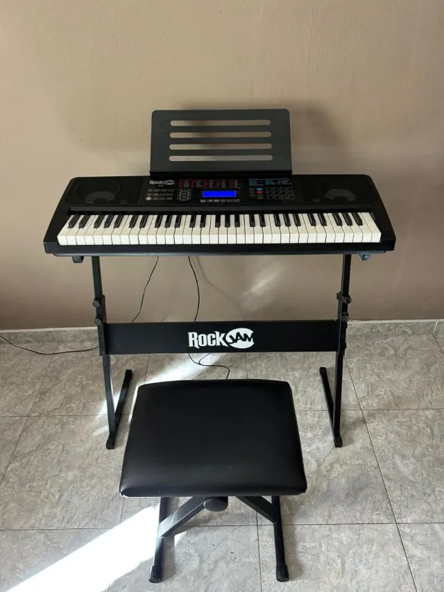 Detalles del productoTeclado Rock Jam de 61 teclas, ideal para iniciarse en la música. Incluye soporte y banqueta.