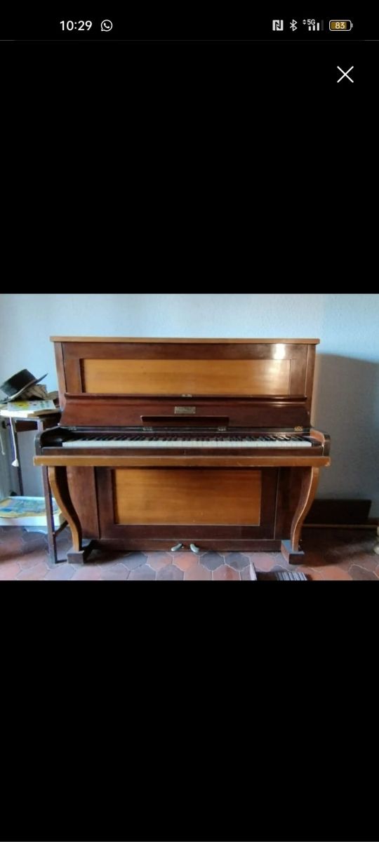 Piano vertical de madera con un diseño clásico. - Acabado en madera oscura. - Teclado de marfil y ébano. - Pedales metálicos.