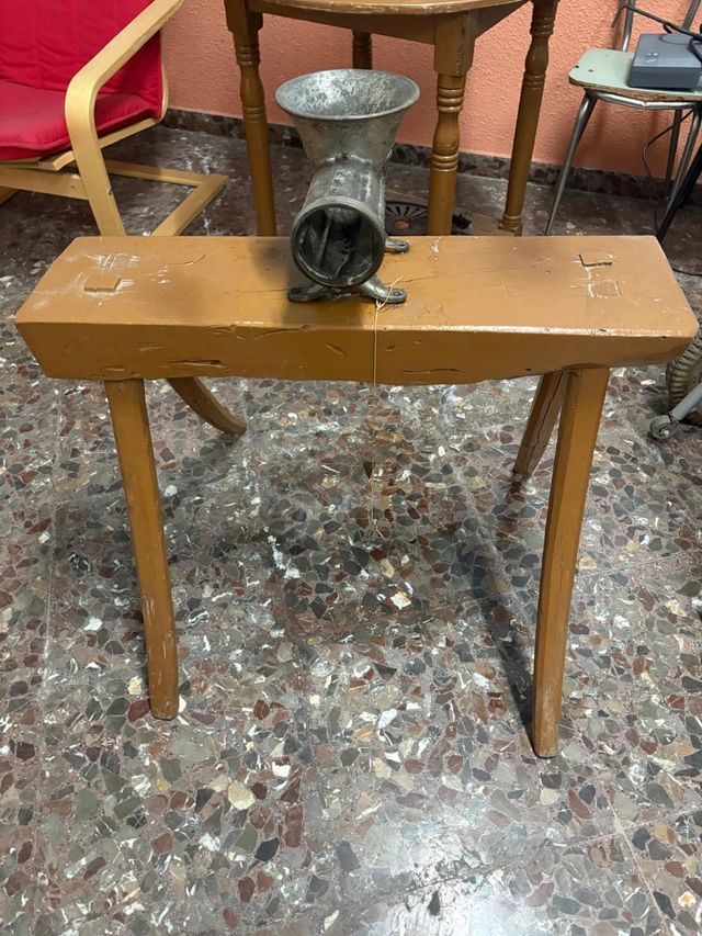 Detalles del productoSe vende picadora de carne antigua. Es de metal y se encuentra sobre una mesa de madera.