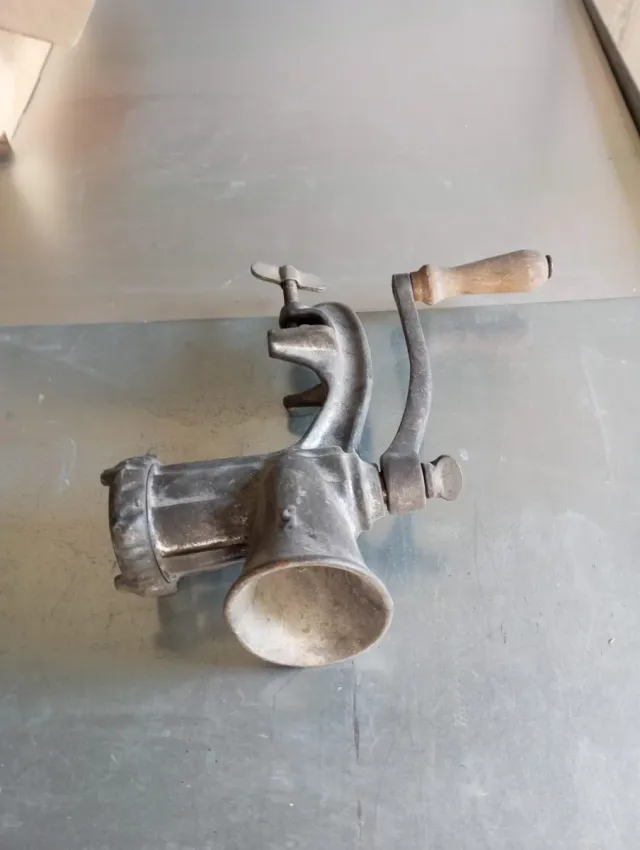 Detalles del productoMáquina antigua para picar carne, de tamaño pequeño. Ideal para coleccionistas o para uso decorativo.