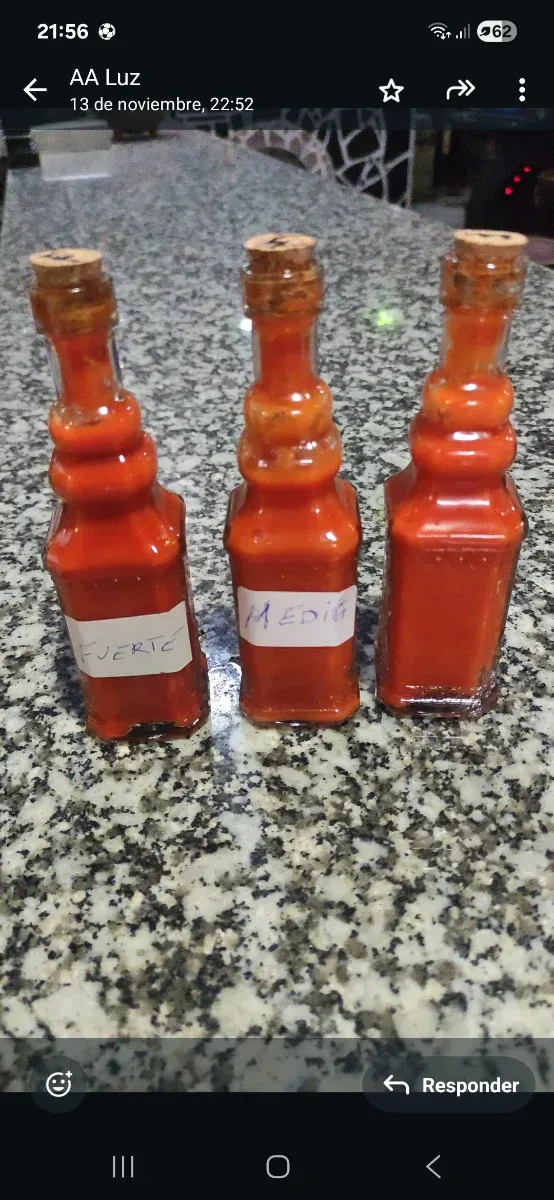 Tres botellas de picante natural casero. - Botella Fuerte - Botella Media - Botella sin etiqueta