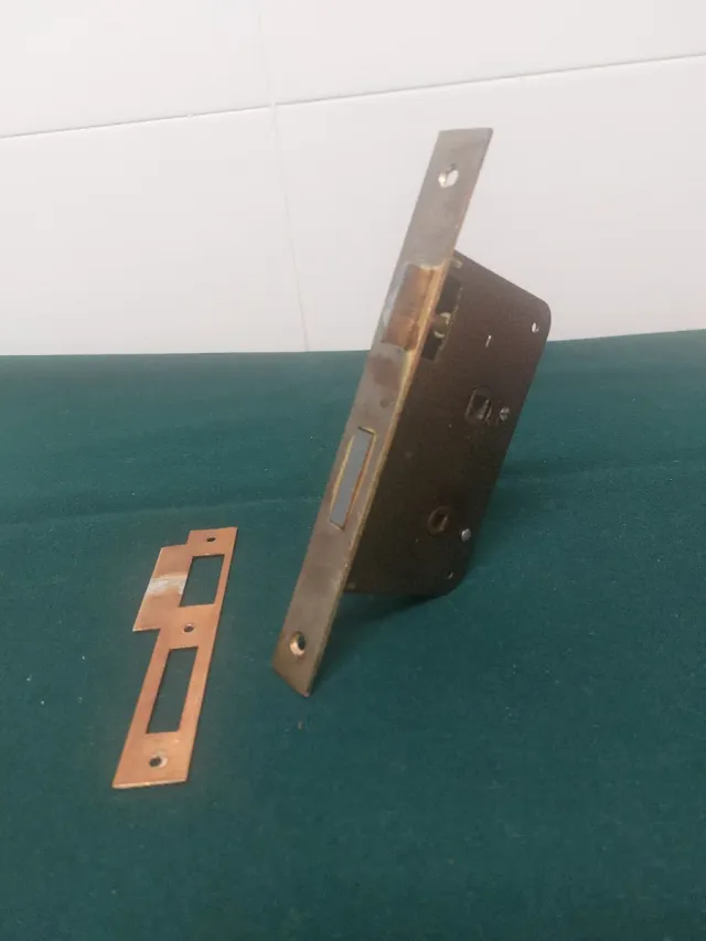 Sistema mecánico robusto, propio de herrajes antiguos, funciona correctamente