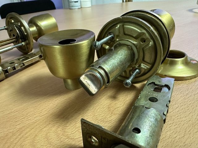Conjunto de picaporte y cerradura en acabado dorado. - Mecanismo de cerradura. - Picaporte con roseta. - Tornillos de fijación.