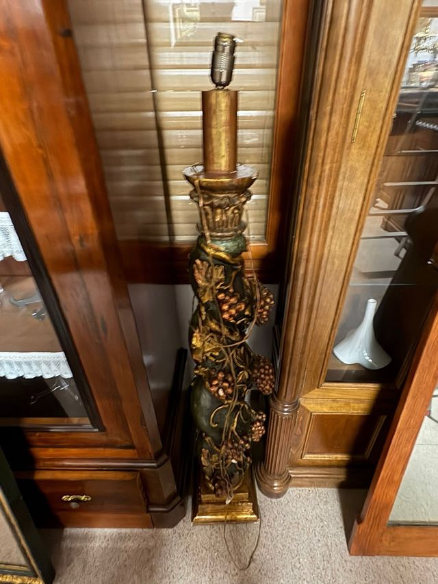 Pie de lámpara antiguo con un diseño detallado. - Base dorada. - Cuerpo con motivos de vid y uvas. - Acabado en verde y dorado.