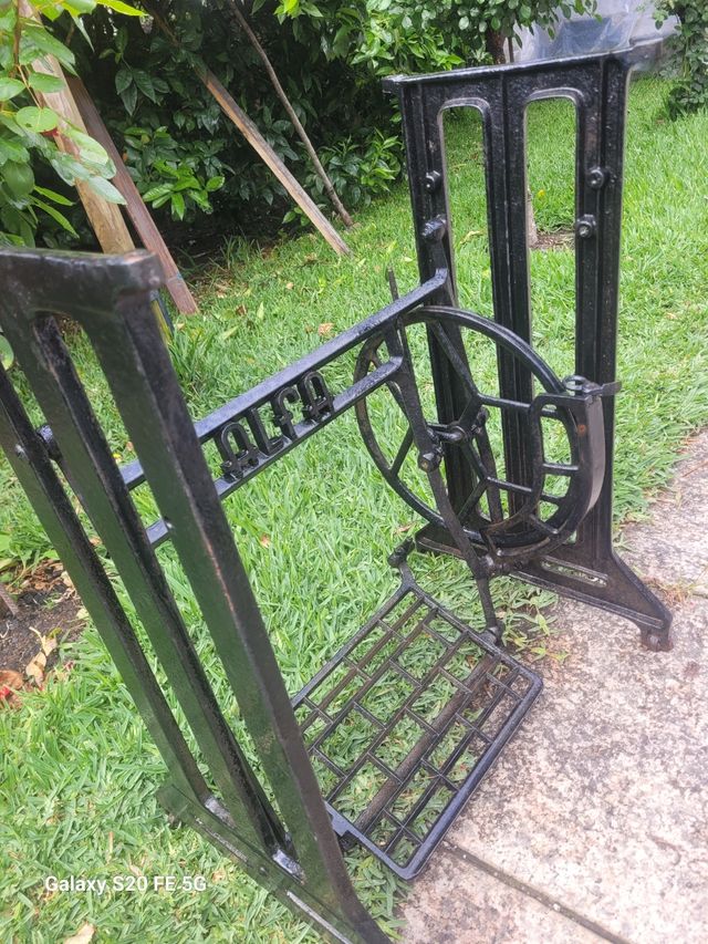 Pie de maquina de coser antigua en muy buen estado restaurada hace 5 años precioso para adornar o hacer 1 mesa funciona perfectamente precio negociable