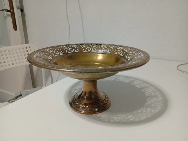 Elegante pie o frutero de alpaca con un diseño calado en el borde. - Base con detalles ornamentales. - Interior dorado.
