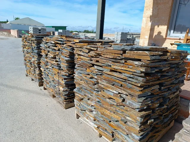Lote de piedra natural con acabado óxido en tonos grises. Ideal para revestimientos y decoración. - Piedra de pizarra. - Tonos grises y ocres. - Formato irregular.