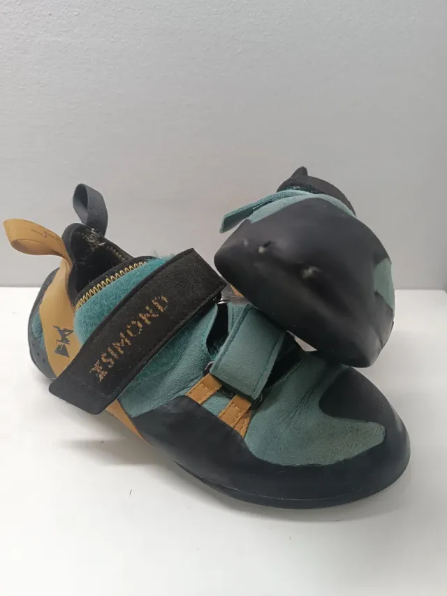 Pies de gato Simond Vertika en color verde y detalles en marrón. - Cierre con velcro. - Suela de goma. - Diseño asimétrico. Punteras desgastadas