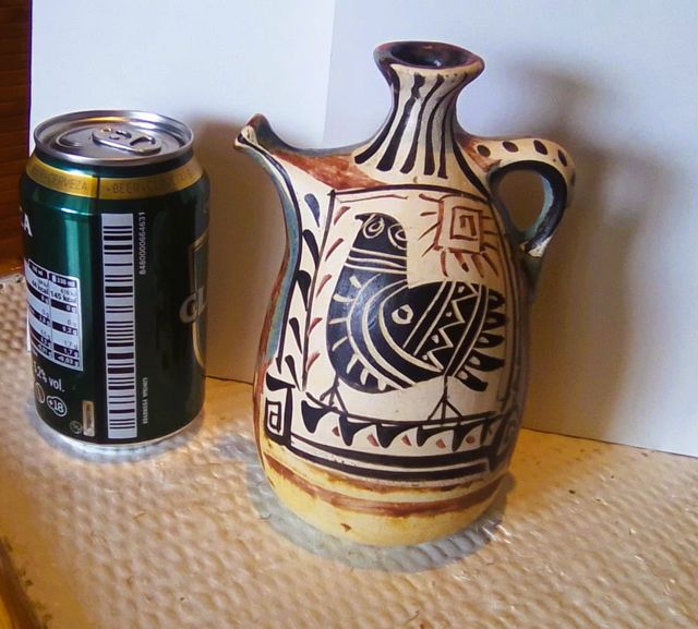 Detalles del productoJarrita o cántaro cerámico de estilo ibérico antiguo, concretamente inspirado en la cerámica ibérica levantina (siglos V–I a. C.), Se trata de una reproducción moderna o reinterpretación artesanal (siglo XX–XXI), muy habitual en talleres de cerámica histórica o decorativa. La iconografía representa (Pez = vida, agua, fertilidad; Espirales = ciclo vital, energía, continuidad; Geometría = orden y protección simbólica)