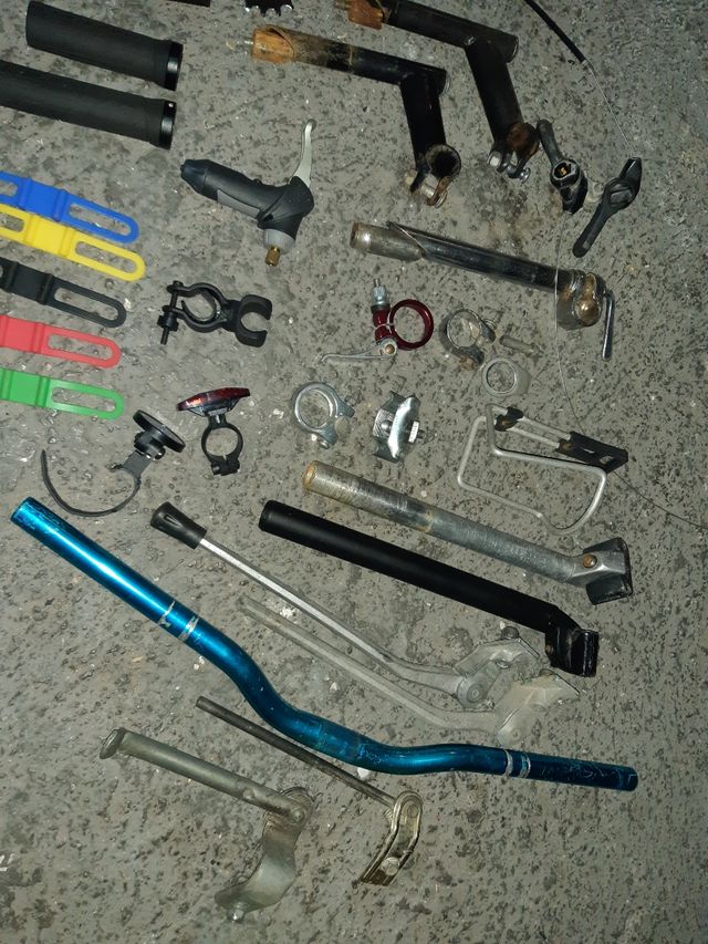 Detalles del productorecambio o pieza de bicicleta mtb montaña paseo Vintage biela.luz trasera reflectante trasero.soporte linterna.puños .adaptador para bombin. tija de sillín frenos de puente.manetas de cambio.pedal El Portabotellas ESTA VENDIDO llaves Antiguas las Zapatas están vendidas .Luz Trasera Vendida. Manillar de aluminio Portamaletas en mi perfil