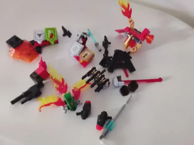 Lote de piezas variadas de Lego. - Incluye escudos, armas y accesorios. - Piezas de diferentes colores y formas.