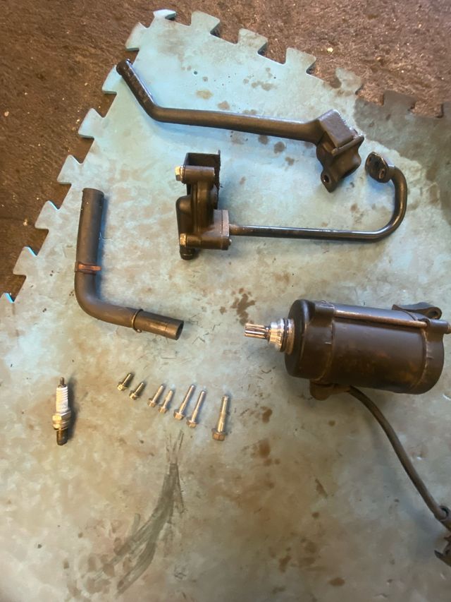 Conjunto de piezas sueltas. - Motor de arranque. - Bendix. - Palanca de arranque. - Bujía. - Tornillos varios.