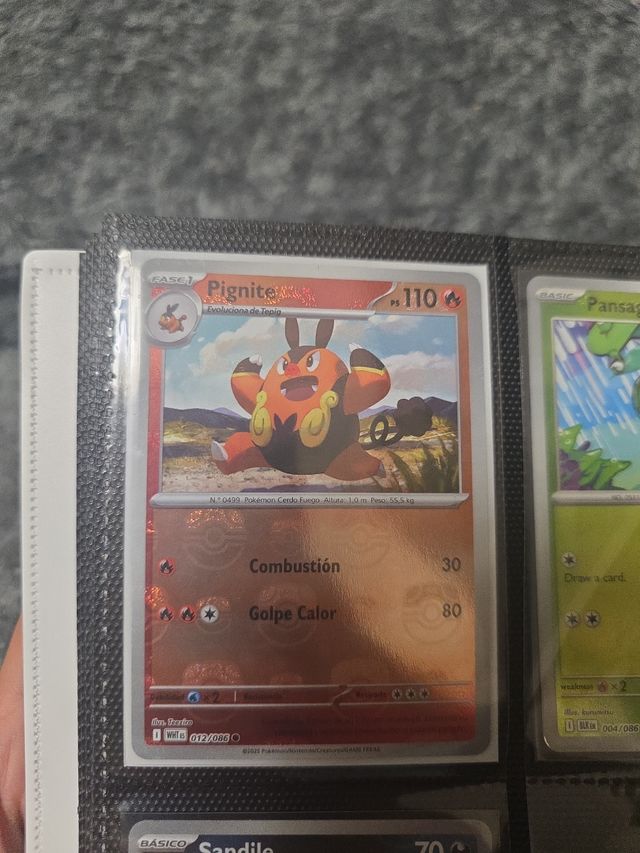 Carta Pokémon de Pignite, fase 1. - Número de carta: 012/086. - PS: 110. - Ataques: Combustión (30) y Golpe Calor (80). - Ilustrador: Teeziro.