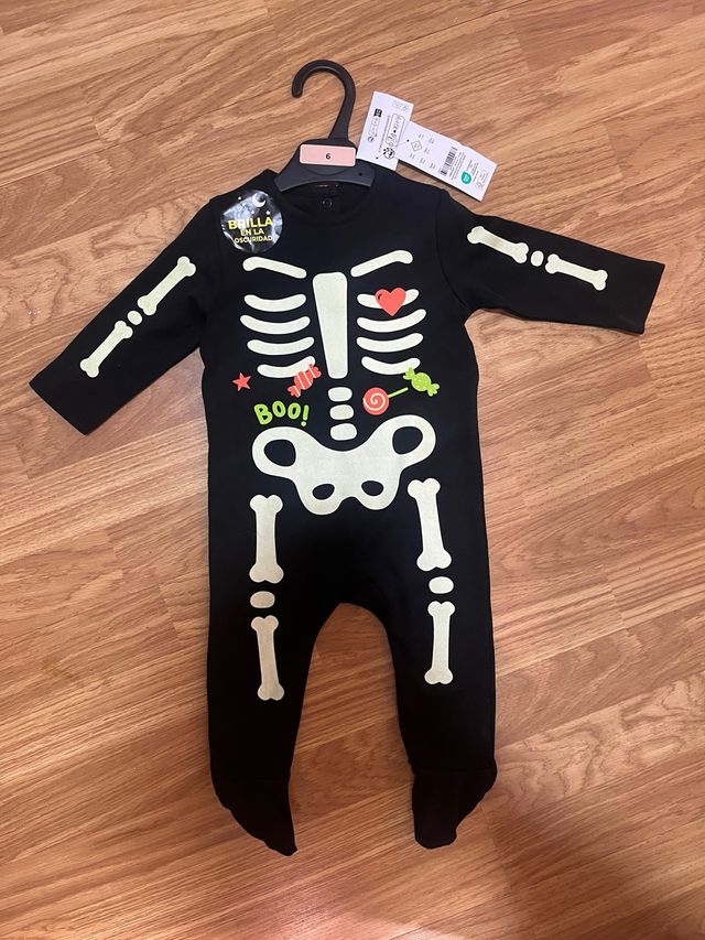 Este pijama negro tiene un diseño de esqueleto que brilla en la oscuridad, perfecto para Halloween. Incluye detalles divertidos como caramelos y la palabra BOO!.