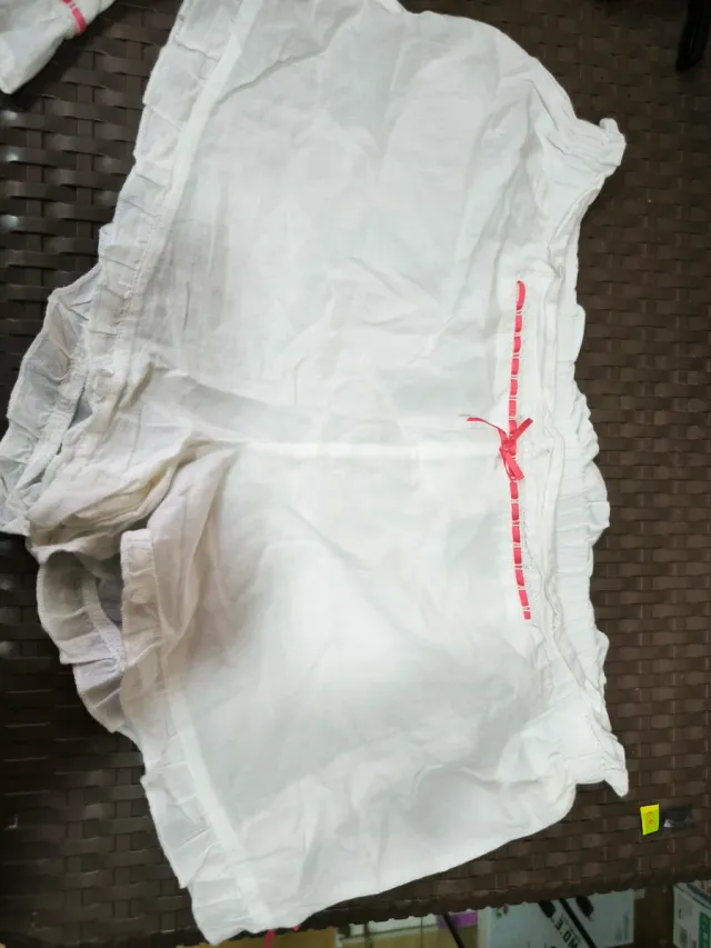 Pantalones cortos blancos con un diseño delicado y femenino. - Tejido ligero y transpirable. - Detalle de volantes en los bordes. - Adorno de lazo rojo en la cintura.